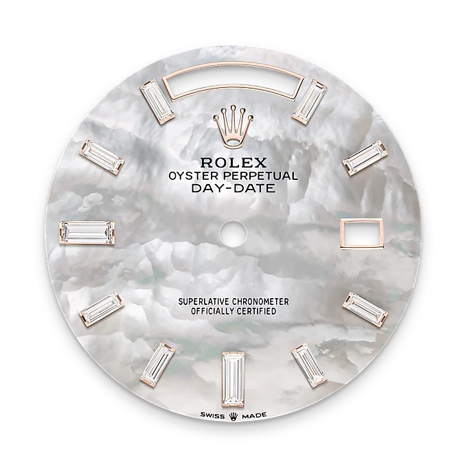 This dial features 10 baguette-cut diamonds. Mother-of-pearl is by its nature full of mystery and surprises. Depending on its origin, it can be pink, white, black or yellow. It differs in colour, intensity and structure according to the part of the shell from which it is extracted. At Rolex, mother-of-pearl is never artificially coloured. Instead, particular know-how and skill are devoted to simply highlighting its natural beauty and preserving the original hues. As all mother-of-pearl dials are unique pieces, an identical dial will never be found on another wrist.